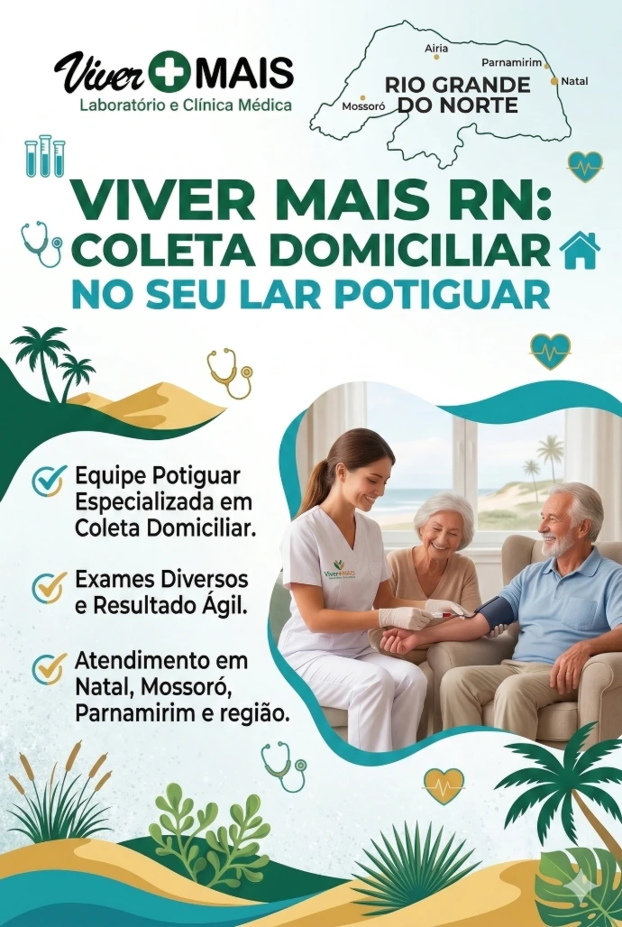 Coleta domiciliar Viver + MAIS no conforto do seu lar potiguar! Exames diversos com resultado ágil e equipe especializada.